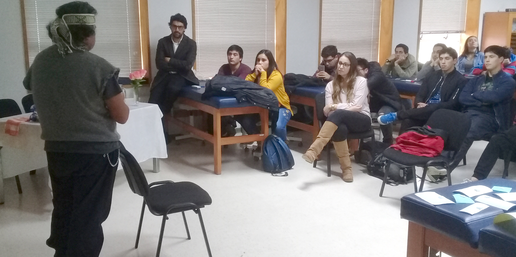 Durante el mes de mayo se realizó un taller con 30 estudiantes de 5to año de kinesiología que ya están en su periodo de práctica. El tema fue la salud intercultural en el sistema público; para ello vino la Coordinadora de Procesos Interculturales en Red del Hospital Base de Osorno, María Angélica Levicán, nutricionista titulada en ULagos. Ella explicó cómo funciona el procedimiento cuando hay pacientes que requieren atención con pertinencia según su pertenencia cultural. Participó en este taller Carlos Purray, un componedor de huesos (l’awentufo) que colabora con los operativos Cesfam realizados en el marco de la ejecución del Programa Especial de Salud y Pueblos Indígena (PESPI)