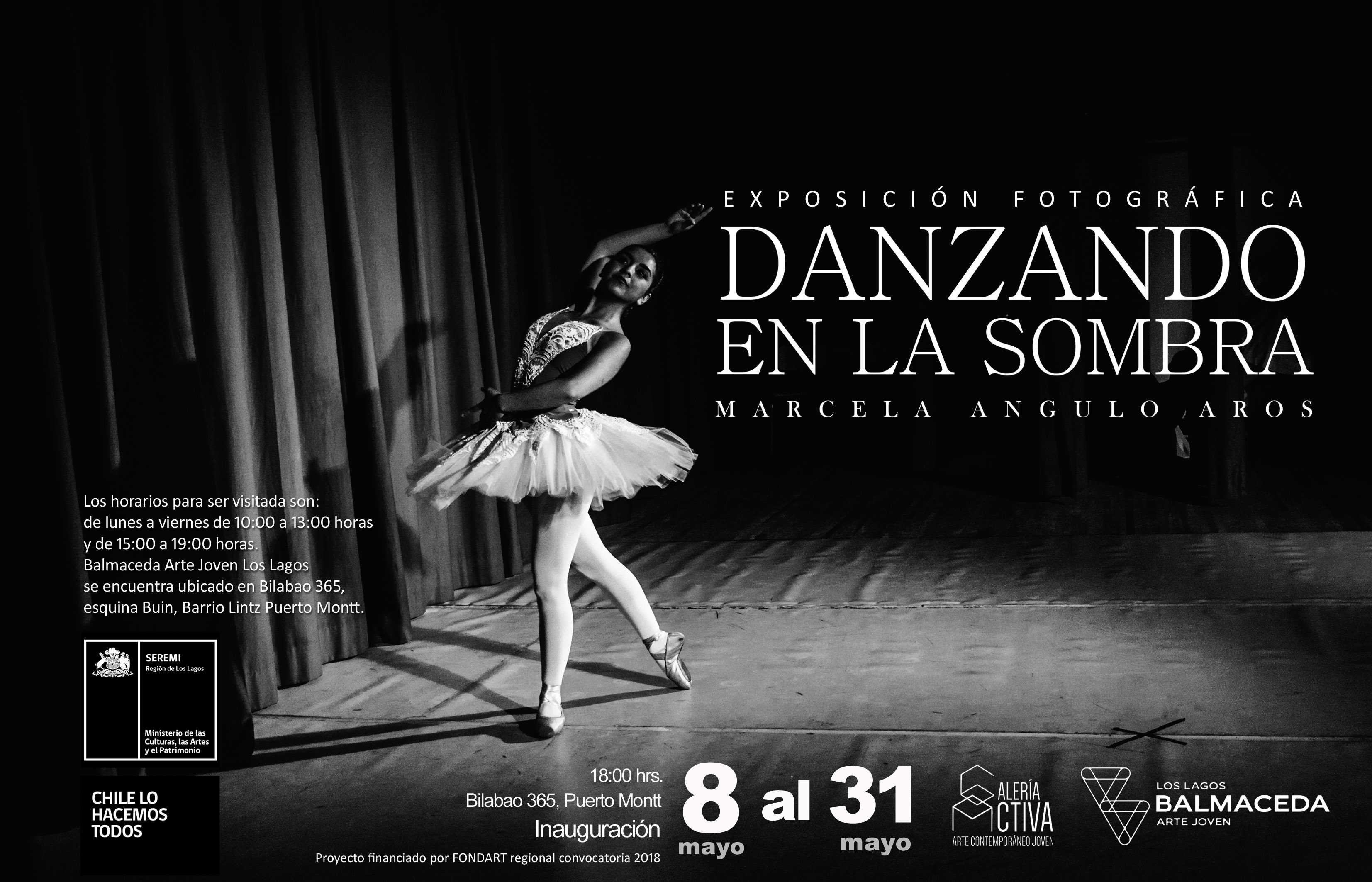 La exposición “Danzando en la Sombra” de Marcela Angulo podrá ser visitada en la sede regional de Balmaceda Arte Joven Los Lagos, ubicada en calle Bilbao 365 en Puerto Montt de lunes a viernes de 10:00 a 13:00 y de 15:00 a 19:00 hrs.