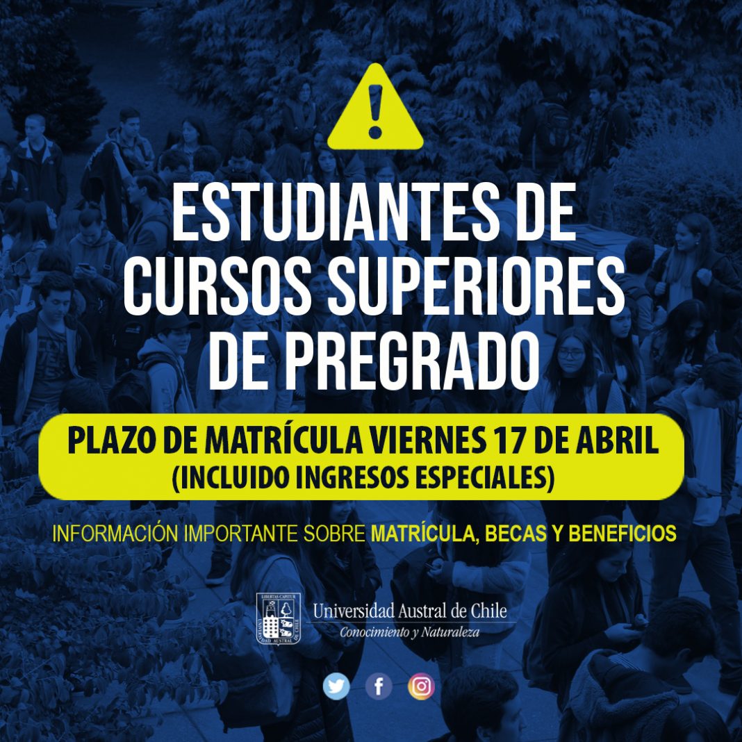 Como parte de las medidas de protección de la salud de toda la comunidad universitaria, en Valdivia, Osorno, Puerto Montt y Coyhaique, se ha dispuesto para todos los alumnos de cursos superiores, realizar los trámites de matrícula de manera remota vía online en el sitio web www.uach.cl en Infoalumnos, hasta el día viernes 17 de abril.