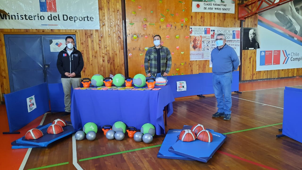 De esta manera, el Seremi del Deporte, Matias Bahamonde junto al Director Regional (S) IND, Patricio Morales hicieron entrega de materiales al técnico Miguel Araya, consistentes en balones de básquetbol y medicinales con rebote, conos lentejas, bandas elásticas de resistencia, colchonetas y pesas, entre otros.