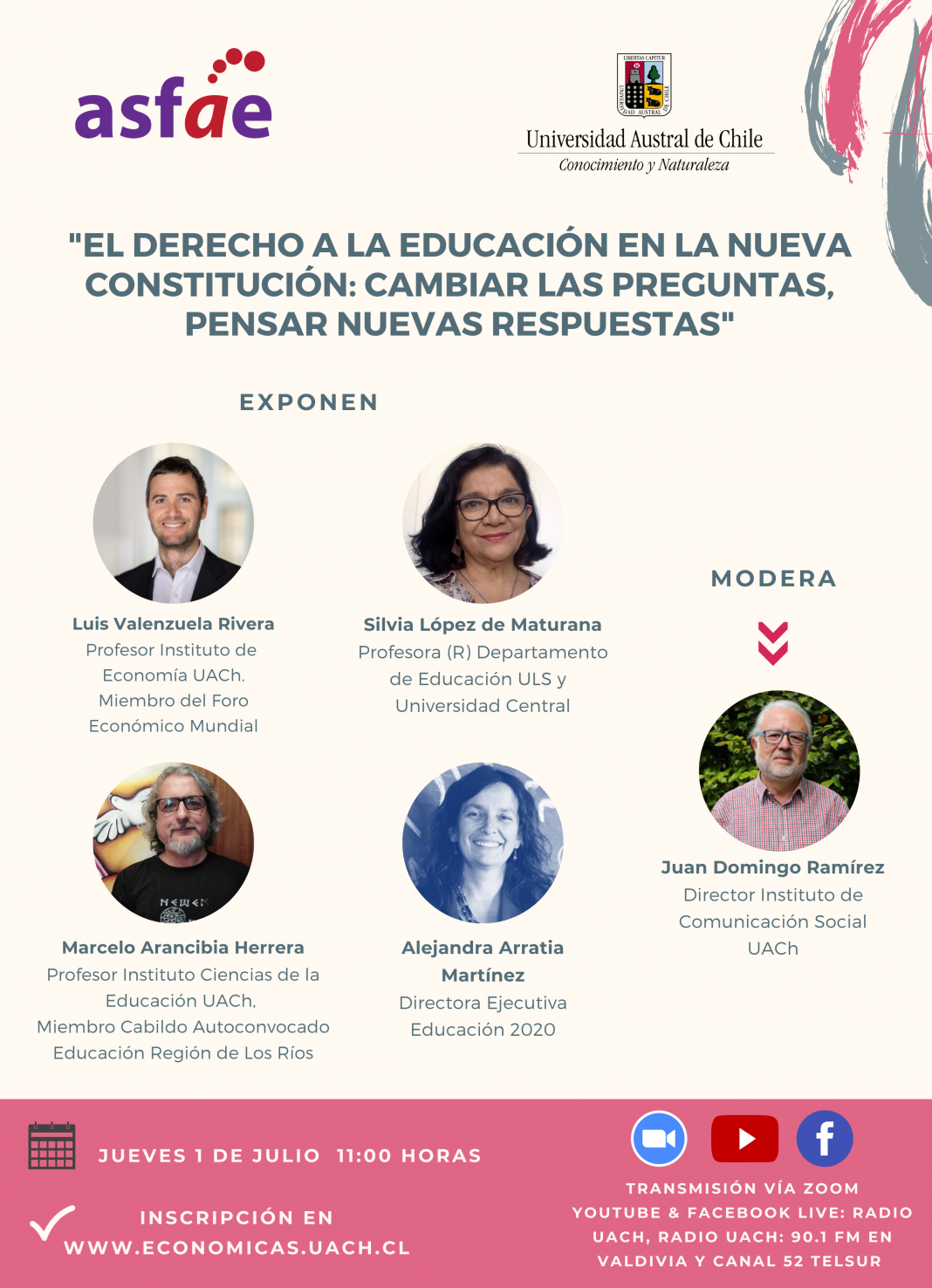 En este caso, el panel estará compuesto por el Profesor del Instituto de Economía de la UACh y miembro del Foro Económico Mundial, Dr. Luis Valenzuela Rivera; la académica de la Universidad Central, Universidad de La Serena y Doctora en Pedagogía, Prof. Silvia López de Maturana; el Académico del Instituto de Ciencias de la Educación de la UACh y miembro del Cabildo autoconvocado de Educación en la Región de Los Ríos, Dr. Marcelo Arancibia; y la Directora Ejecutiva de la Fundación Educación 2020, Alejandra Arratia. La Moderación estará a cargo del Periodista y Director del Instituto de Comunicación Social de la UACh, Dr. Juan Domingo Ramírez.