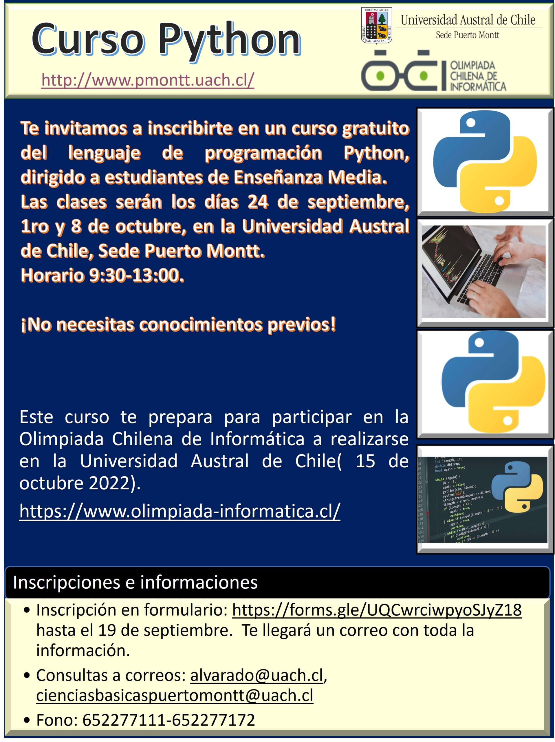El Centro de Docencia Superior en Ciencias Básicas (CiBa) junto al Instituto de Gestión e Industria de la Universidad Austral de Chile Sede Puerto Montt invitan al Curso de Programación del lenguaje Pyhton iniciativa gratuita enfocada a estudiantes de educación media interesados/as en participar en la próxima Olimpiada Chilena de Informática 2022(OCI), que se realizará por primera vez en Puerto Montt.