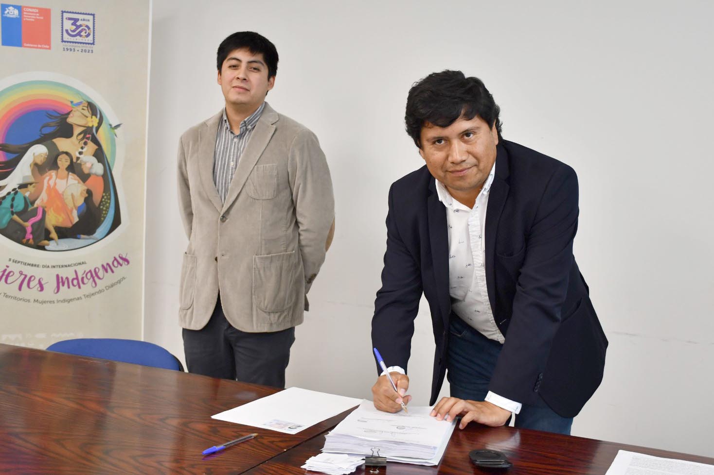 Hasta la Dirección Nacional de CONADI, ubicada en Temuco, llegó la directiva de la comunidad Cocauque de Quellón, integrada por Elías Colivoro Chiguay, presidente; Gabriela Chiguay Gavie; y Victoria Ruiz Cayún, secretaria, para firmar las escrituras de las tierras en un proceso que iniciaron en 2010 ante CONADI, para restituir las tierras que en 1823 les cedió la corona española a sus antepasados a través de un título de realengo.