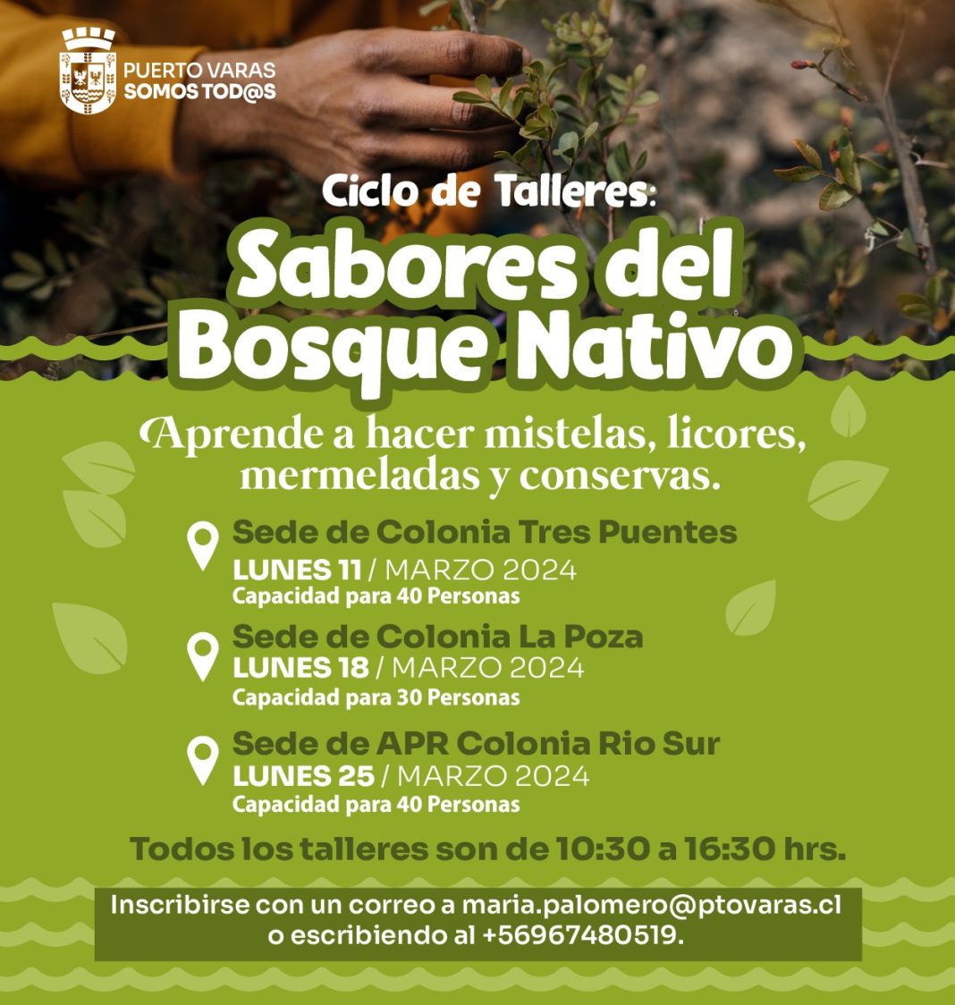 Respecto a estos talleres, Josefa Palomero, encargada de la Unidad de Desarrollo Económico Local del municipio, señaló “los queremos invitar al ciclo de talleres Sabores del Bosque Nativo donde vamos a aprender a hacer mistelas, licores, mermeladas, conservas y por sobre todo poner en valor el bosque que tenemos en el territorio de Puerto Varas. Vamos a trabajar con cauchao, murta, avellanas, así que vamos a aprender a poder armar nuestra despensa sureña de manos de una tallerista con mucha experiencia. Los invitamos a todos a participar a partir del lunes 11 son tres jornadas se pueden inscribir en cualquiera de las tres jornadas al correo maria.palomero@ptovaras.cl”.