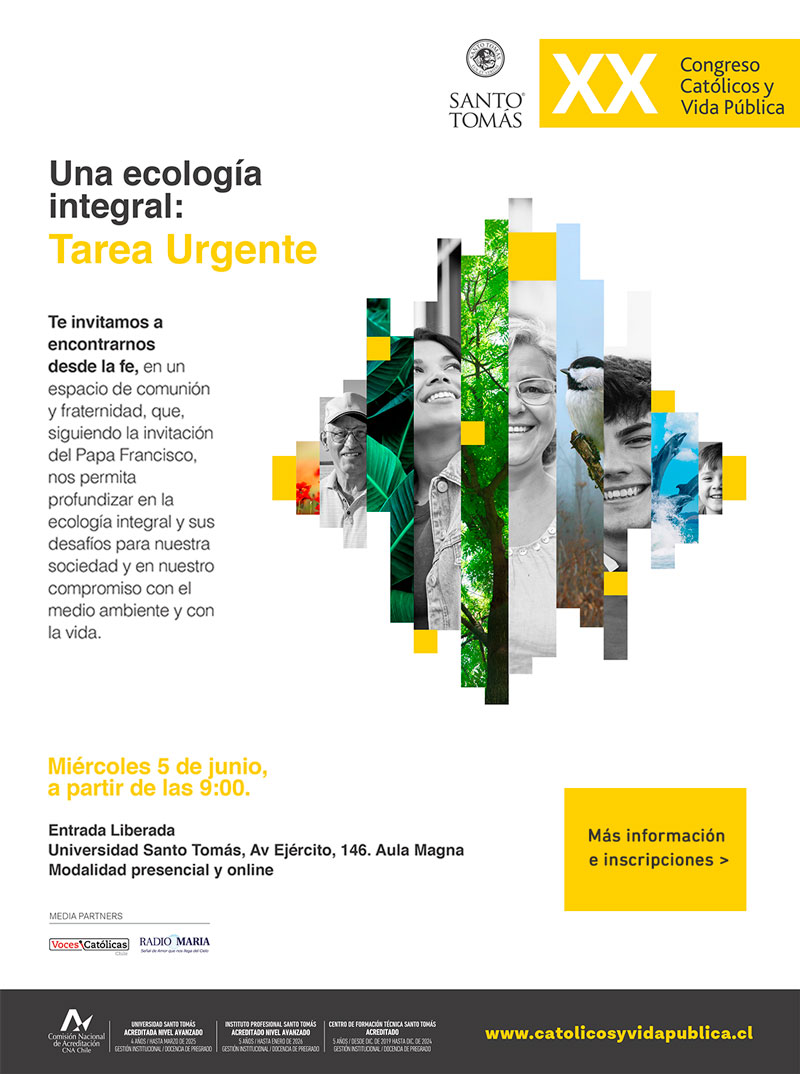 En relación al evento, María Esther Gómez de Pedro, Directora Nacional de Formación e Identidad de Santo Tomás, señaló que “en la vigésima edición de este Congreso abordaremos las implicaciones de una visión responsable de la ecología, así como familiarizarnos con el llamado del Papa Francisco que enfatiza la inclusión de la persona humana tanto en la toma de decisiones como en el cuidado de su vida. Esperamos profundizar en este tema y tomar conciencia de las responsabilidades que conlleva considerar nuestra ‘casa común’ como una creación de Dios confiada a nuestra custodia y con la que estamos interrelacionados».