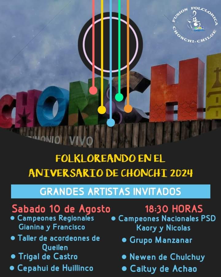 Entre las que se destaca para este sábado 10 de agosto, la “Peña Aniversario de Chonchi”, la cual es organizada por el taller de danza “Fusión Folclórica” y auspiciada por el municipio local, a través de su Alcalde Fernando Oyarzún Macías y el Honorable Concejo Municipal.