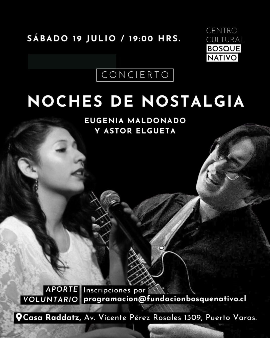 El próximo sábado 19 de julio a las 19:00 horas se presentarán Eugenia Maldonado y Astor Elgueta en Centro Cultural Bosque Nativo, en un concierto de primera titulado “Noches de Nostalgia”, una noche dedicada a los recuerdos, a esos amores que dejaron huella y momentos que viven en la memoria a través de la música jazz y boleros.
