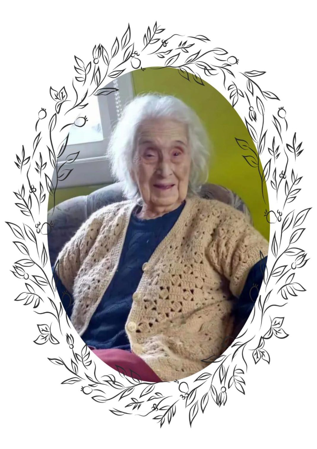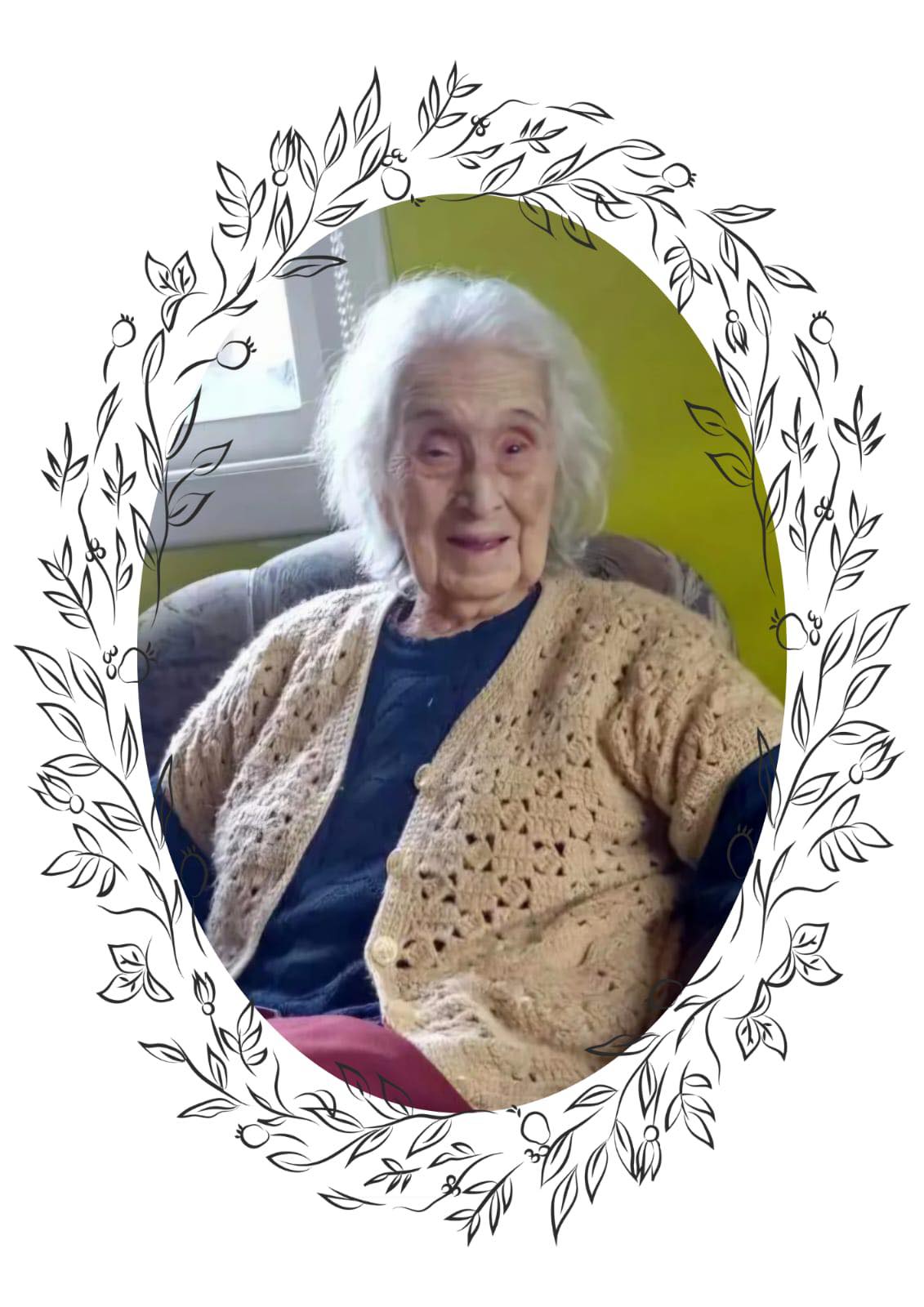 Fallecida a la edad de 102 años. Sus restos son velados en el Salón Velatorio de Funeraria Nazareth Urmeneta 1077 Puerto Montt. Sus funerales se efectuarán este Lunes 23 del