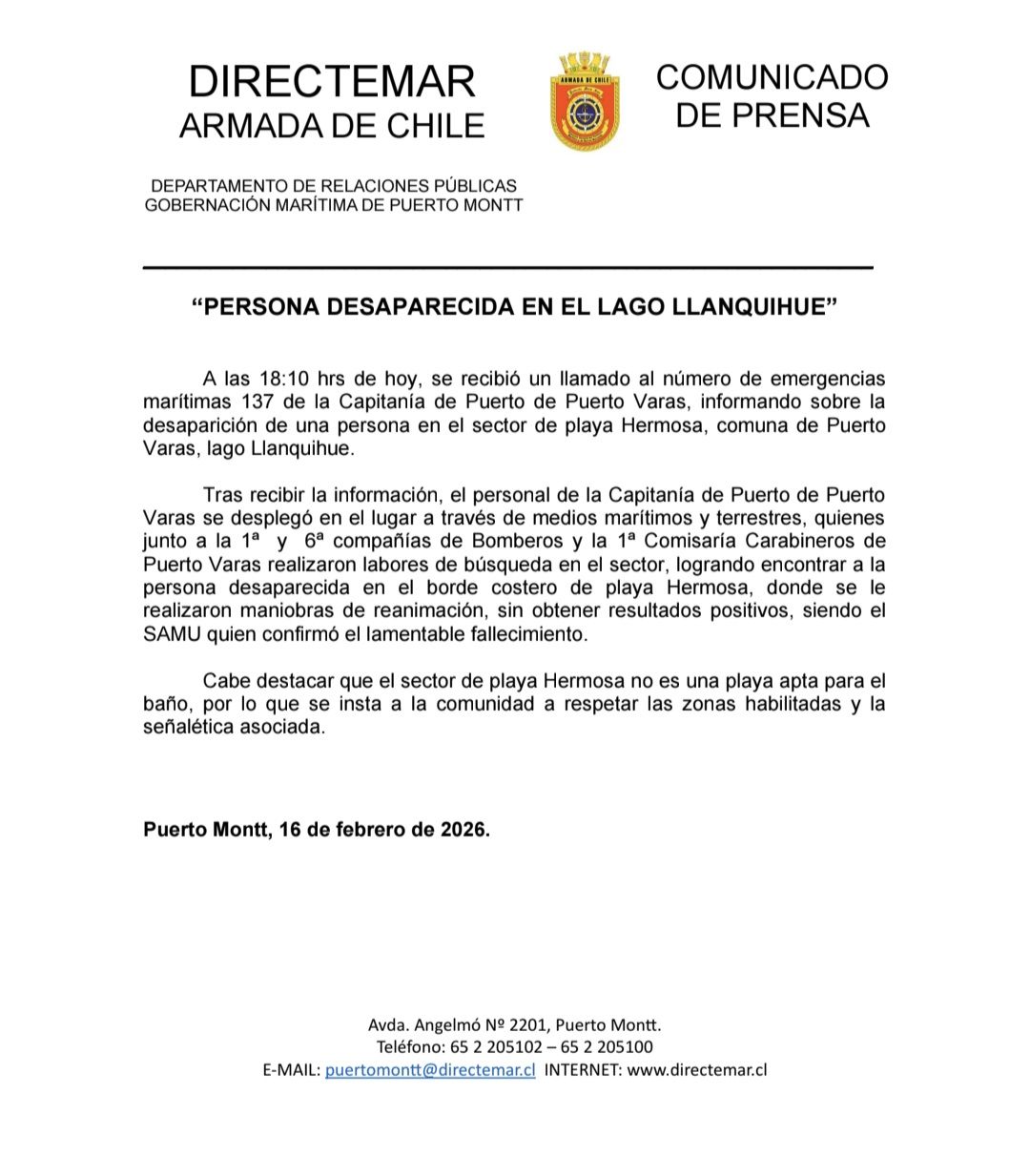 Inicio Policial Persona desaparecida en el Lago LlanquihuePolicial_DestacadasPersona desaparecida en el Lago Llanquihue 16 febrero, 20260FacebookWhatsAppImpresiónXEmailCopy URL Artículos relacionadosMás del autor DeportesChonchi da inicio a la tercera versión del Futsal Escolar AquaChile ActualidadAmplian plazo investigativo por enriquecimiento ilícito Columna de OpiniónSaber reconocer un accidente cerebrovascular a tiempo puede salvar vidas