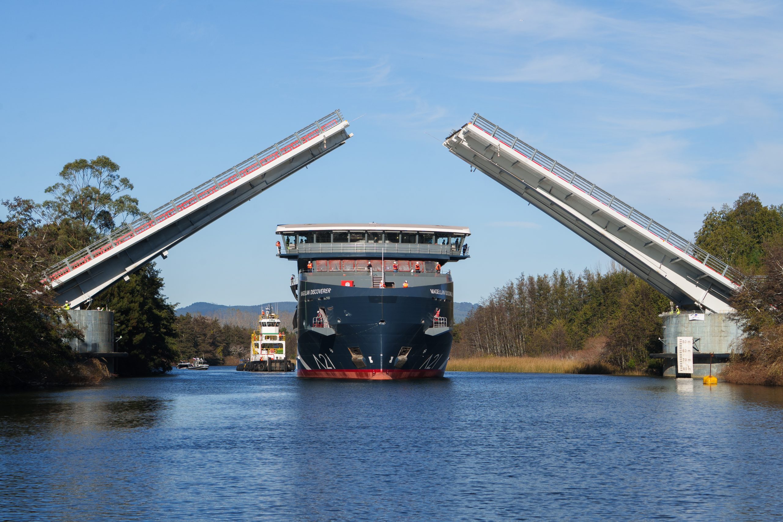 • El Magellan Discoverer completó con éxito su paso por el rio Calle Calle, en una etapa previa a sus pruebas en mar abierto. La embarcación de 94 metros de largo, construida por ASENAV con ingeniería 100% valdiviana para Antarctica21, exigió un complejo basculamiento del Puente Cau Cau para cruzar bajo el viaducto.